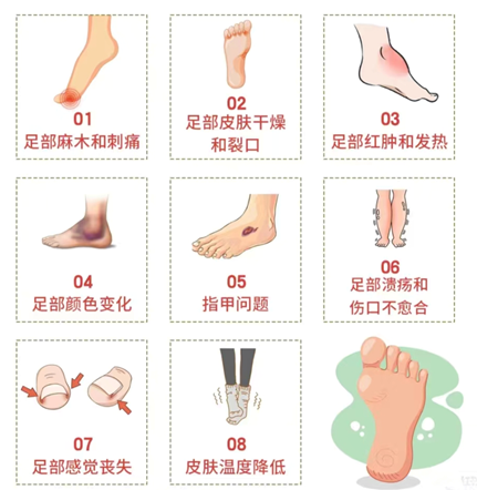 糖尿病足是一个缓慢发展的进程,在早期会出现下肢供血不足、脚趾红肿、间歇性跛行、皮肤干燥、足部蚁行感、肢体麻木等症状。